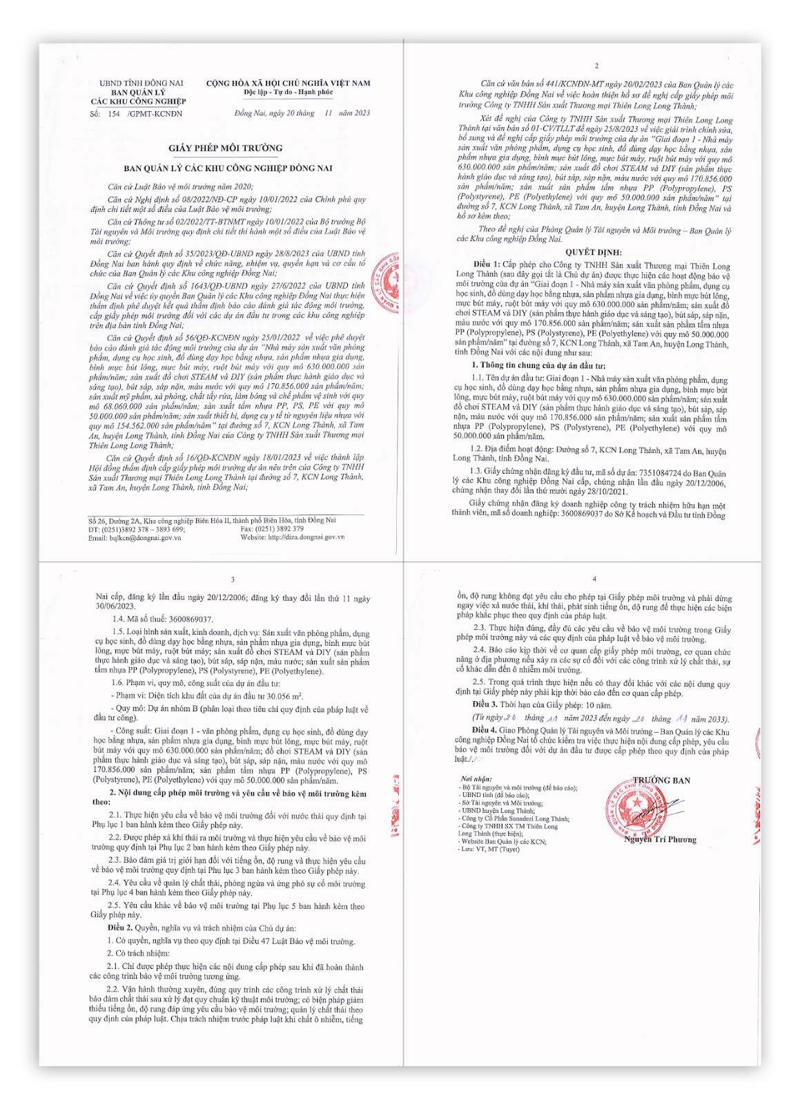 Environmental Permit of Nam Thien Long Production – Trading Co., Ltd.